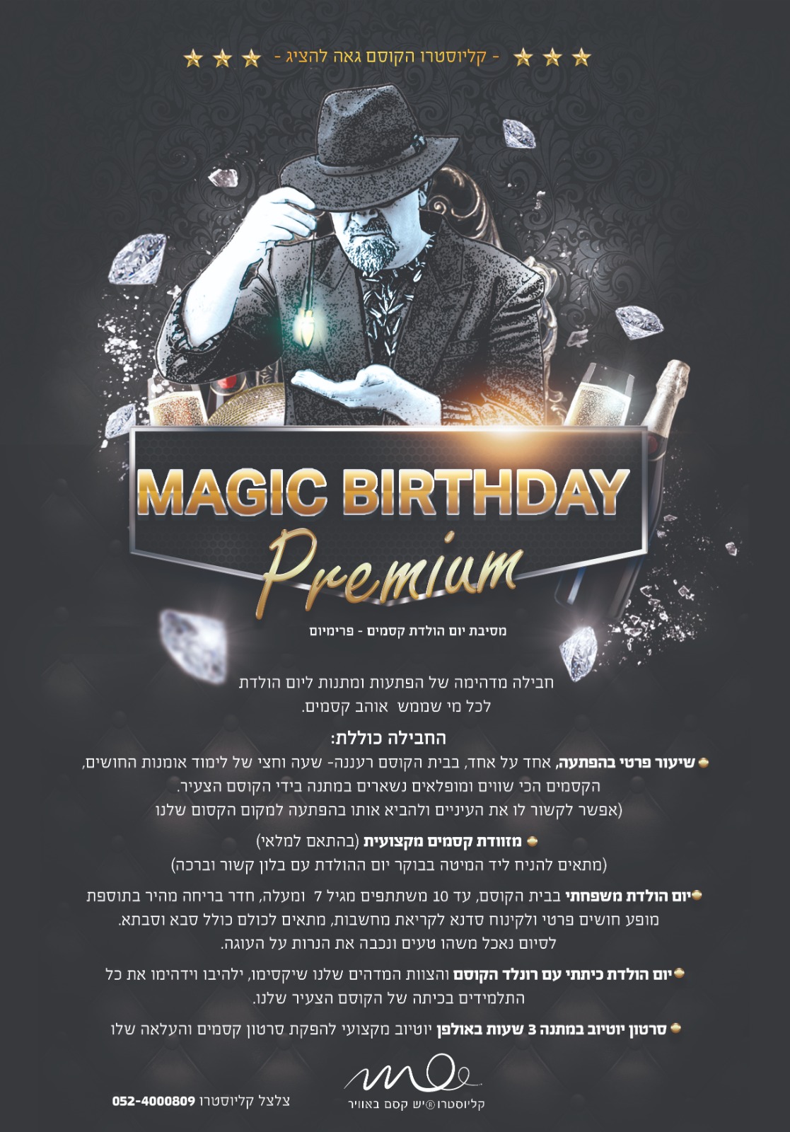 - יום הולדת משפחתי בבית הקוסם, אירוע משפחתי קסום באמת. עד 10 משתתפים מגיל 7 ומעלה, חדר בריחה מהיר בתוספת מופע חושים פרטי ולקינוח סדנא לקריאת מחשבות, מתאים לכולם כולל סבא וסבתא. לסיום נאכל משהו טעים ונכבה את הנרות על העוגה.